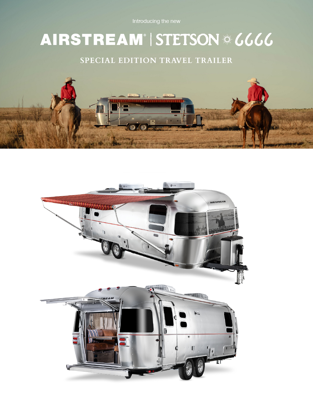 Meet the Airstream Stetson + 6666 Special Edition Travel Trailer, a 27-foot towable Airstream that’s unlike any other. Celebrating the freedom and independent spirit of the West, the Stetson + 6666 Special Edition represents a timeless collaboration between three iconic American brands: Airstream®, Stetson®, and the Four Sixes Ranch®. This Special Edition trailer comes standard with features inspired by wide open spaces, clean air, and adventure on the range, as well as the deep roots in hard work, tradition, and innovation shared by these three iconic brands.
