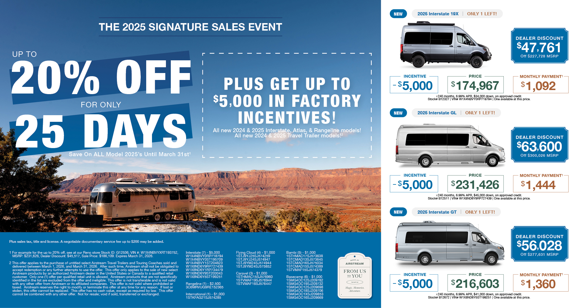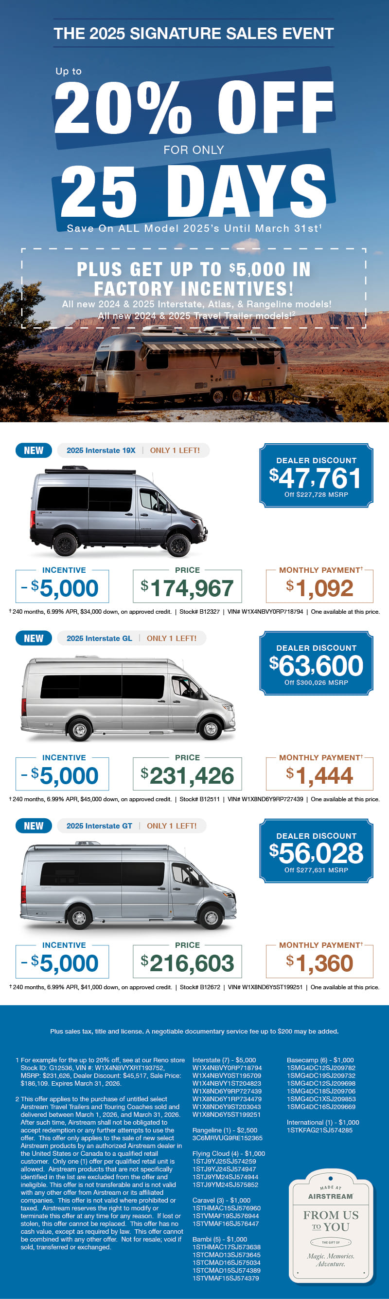 2025 Airstream Interstate 19 The Interstate 19 Touring Coach takes everything that makes the Interstate a stand-out Class B diesel motorhome and wraps it in a smaller, nimbler 19-foot package – one that fits nicely in a standard parking spot. Take off for a solo adventure or get some couple time. Head to the city or the campground. Enjoy every luxu...
